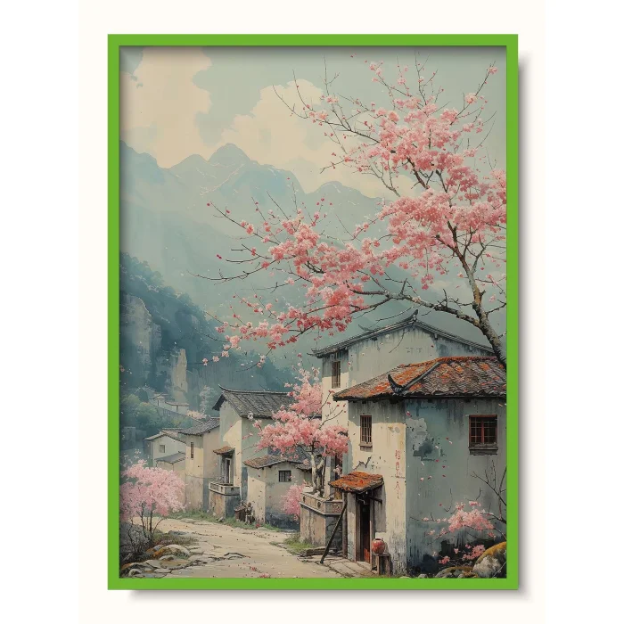 A serene village landscape with cherry blossoms adding a pink hue to the tranquil life amidst the foggy mountains.