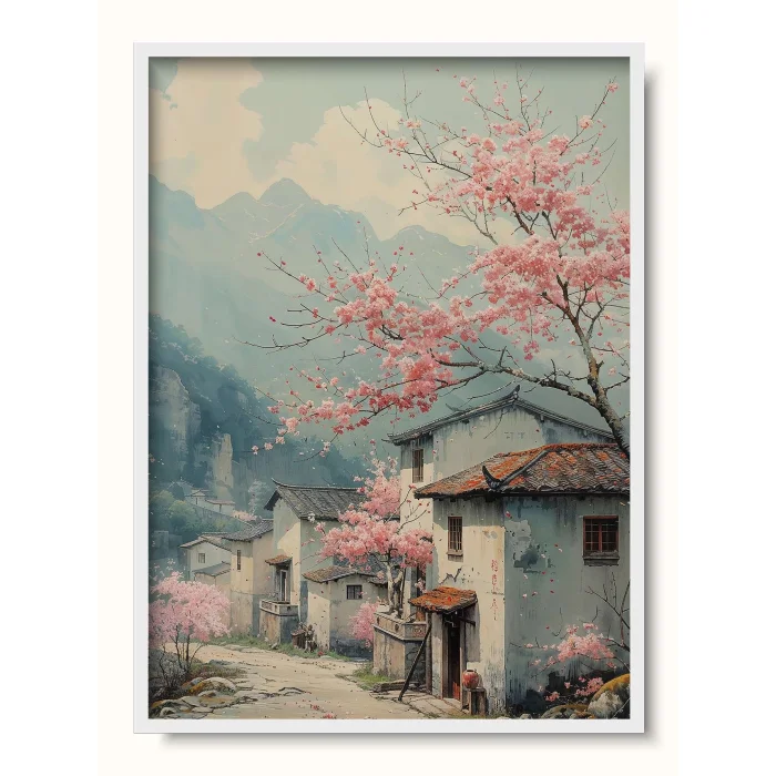 A serene village landscape with cherry blossoms adding a pink hue to the tranquil life amidst the foggy mountains.