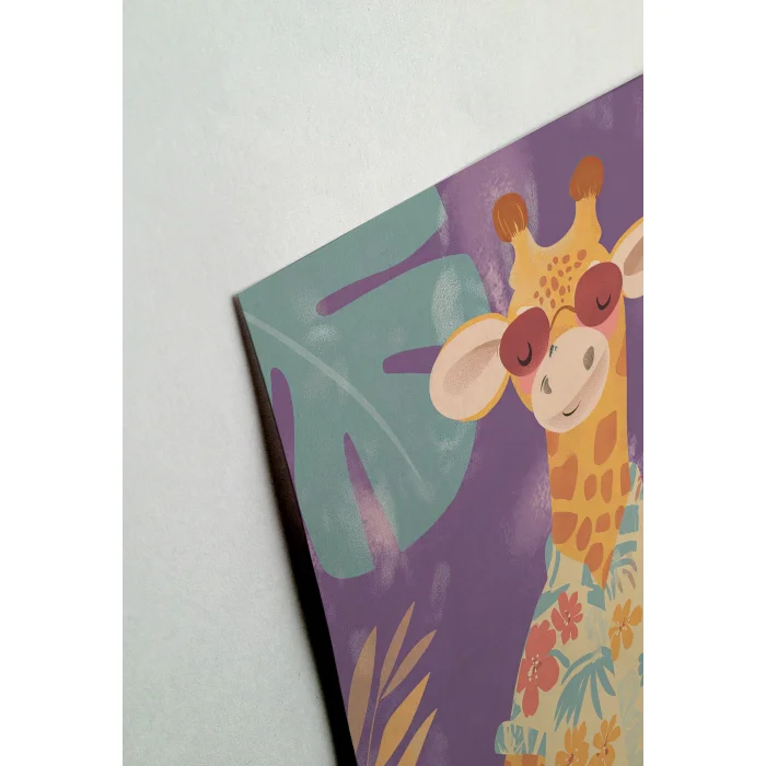 A giraffe dressed in a floral shirt among tropical vegetation.