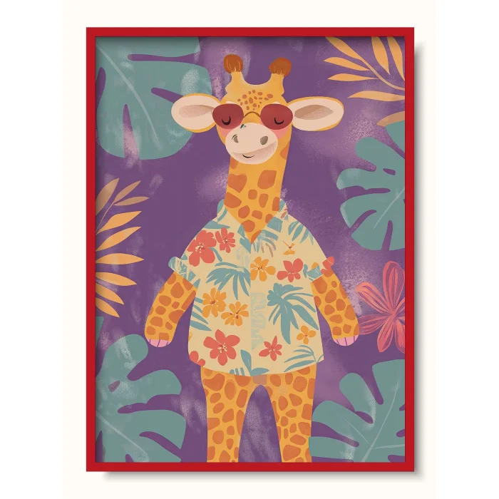 A giraffe dressed in a floral shirt among tropical vegetation.
