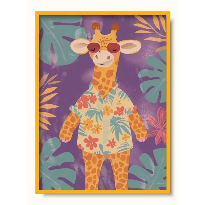 A giraffe dressed in a floral shirt among tropical vegetation.