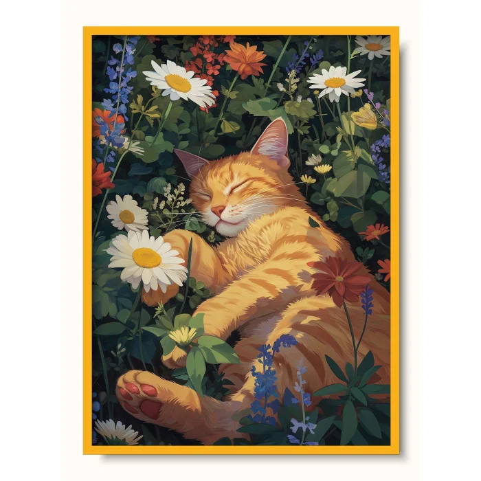 An orange cat taking a peaceful nap among wild flowers, representing the simple happiness of nature.