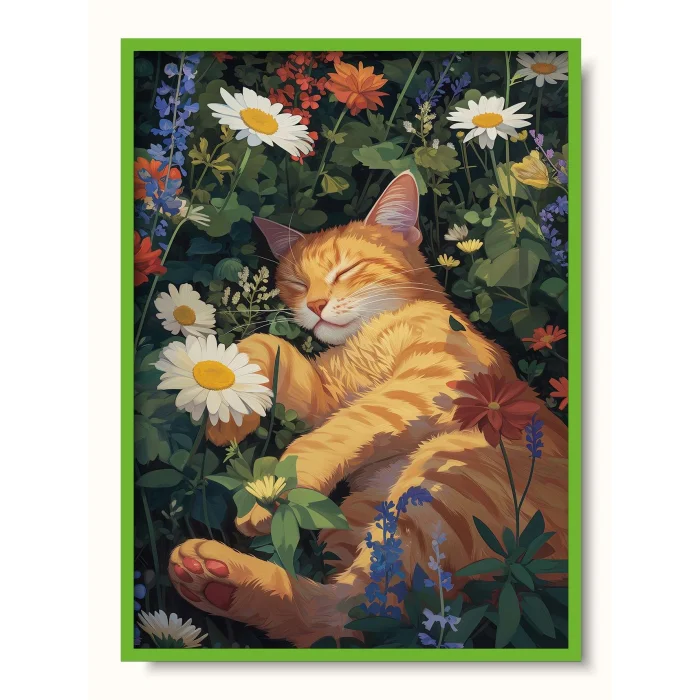An orange cat taking a peaceful nap among wild flowers, representing the simple happiness of nature.