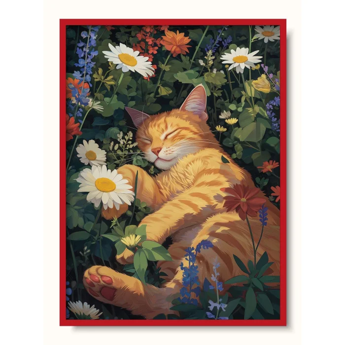 An orange cat taking a peaceful nap among wild flowers, representing the simple happiness of nature.