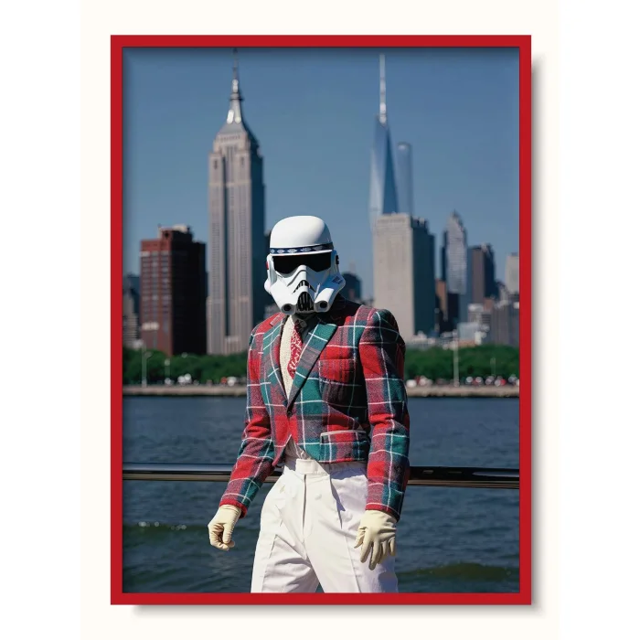 New York City background with a stormtrooper dressed in a wool jacket that is quite trendy.
