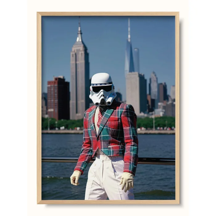 New York City background with a stormtrooper dressed in a wool jacket that is quite trendy.