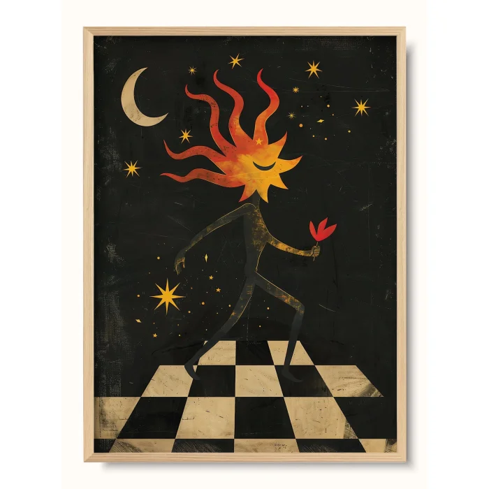 A figure running on a checkered floor, shining with his head. The stars and moon in the background light up the scene.