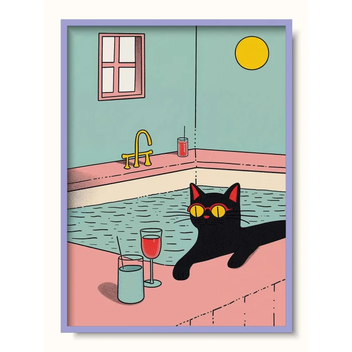 Imagined with retro colors and simple geometric shapes, a black cat enjoying itself in a pool.
