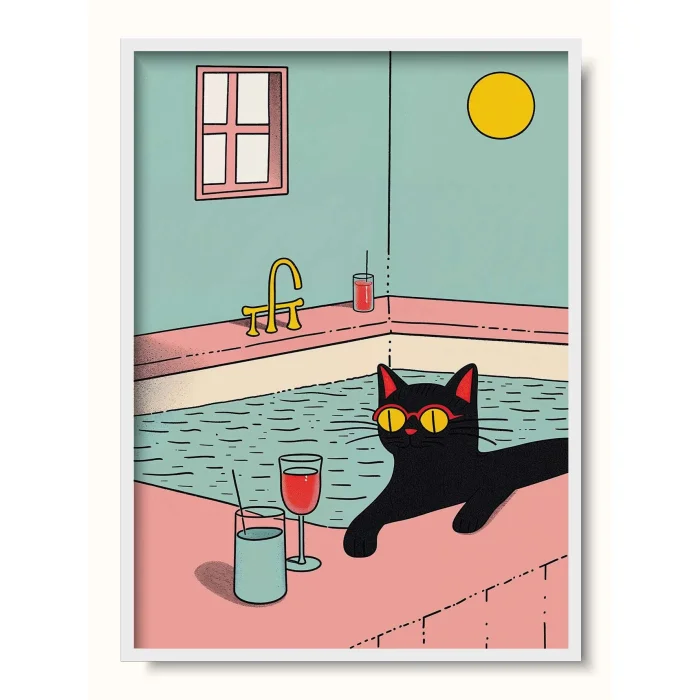 Imagined with retro colors and simple geometric shapes, a black cat enjoying itself in a pool.