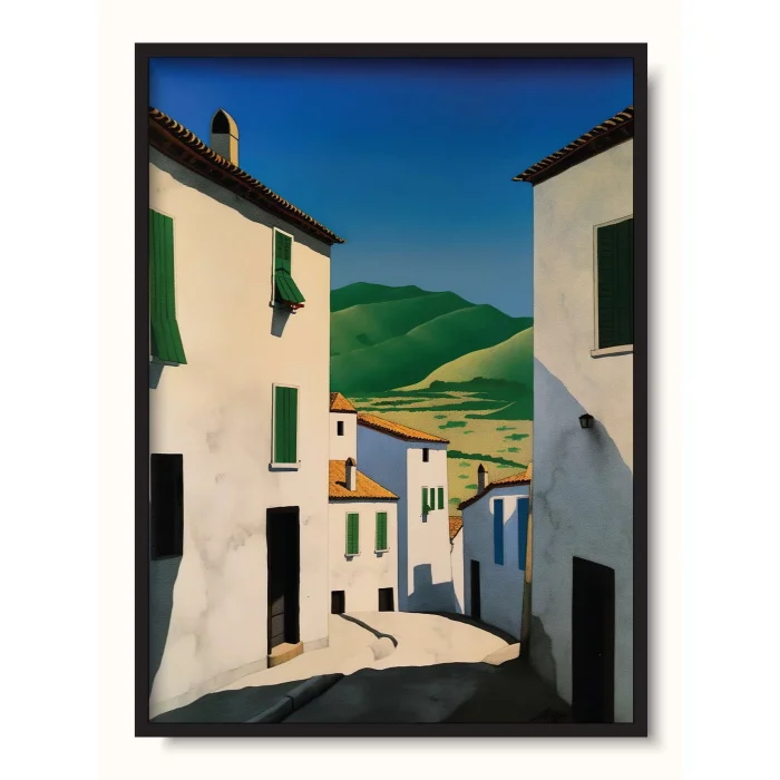 A Mediterranean street surrounded by white buildings that opens to views of the hills in the distance.