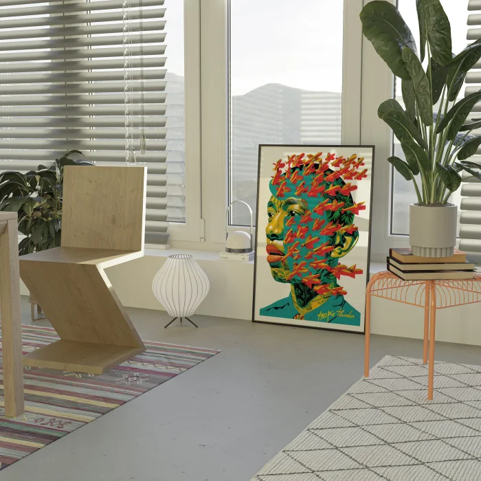 A portrait covered with planes resembling a flock of birds, reflecting themes of identity and the pervasive impact of the conflict.