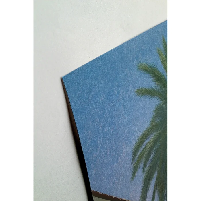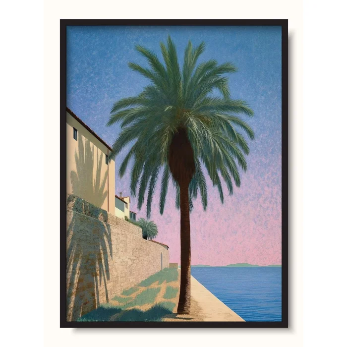 Pastel tone illustration of a palm tree parallel to the sea.