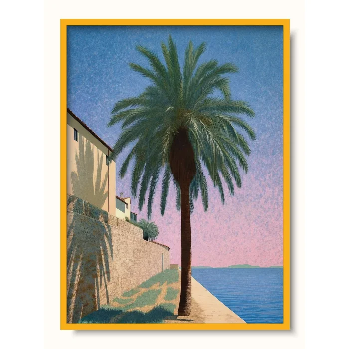 Pastel tone illustration of a palm tree parallel to the sea.