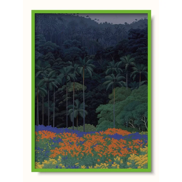 Tall palms towering over a colorful field with orange, blue and yellow flowers.