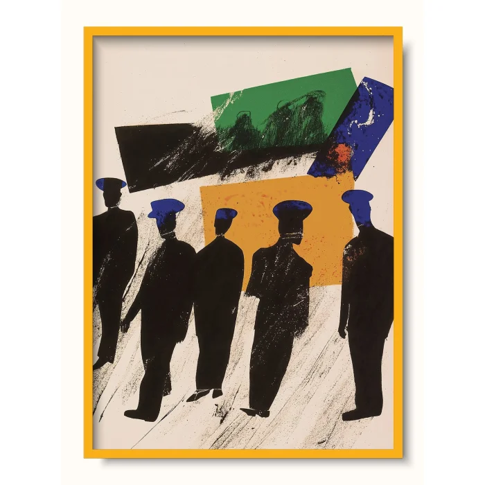 Figures standing among colorful geometry, waiting.