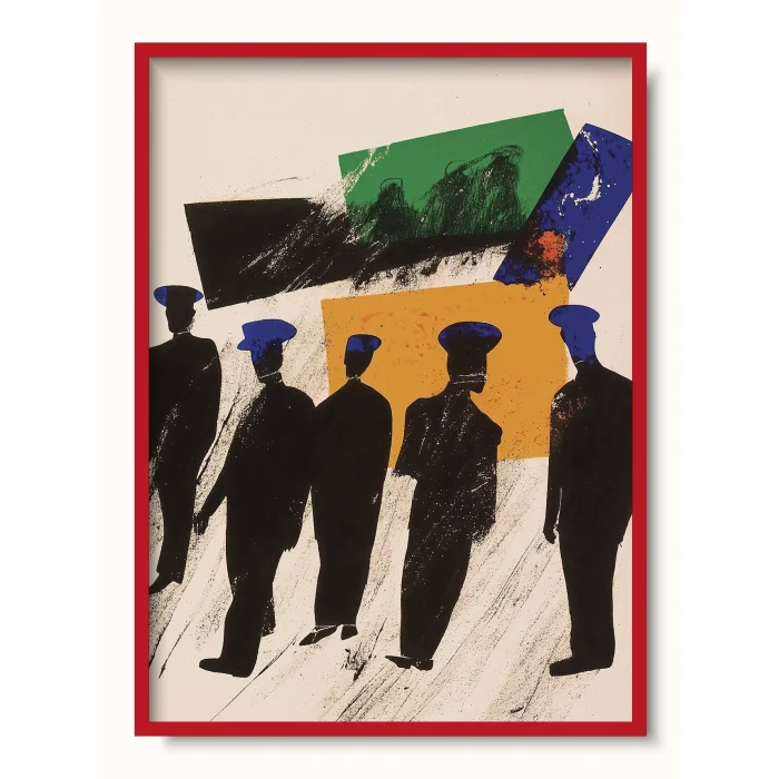 Figures standing among colorful geometry, waiting.