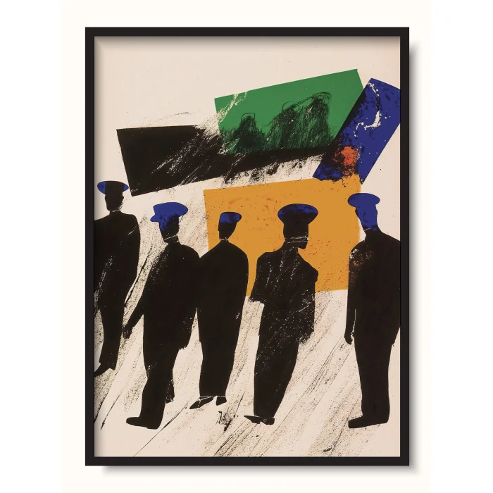 Figures standing among colorful geometry, waiting.
