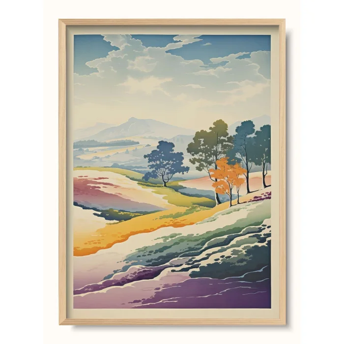 A landscape in which the landscape is layered, a depiction of different terrains and seasons at once.