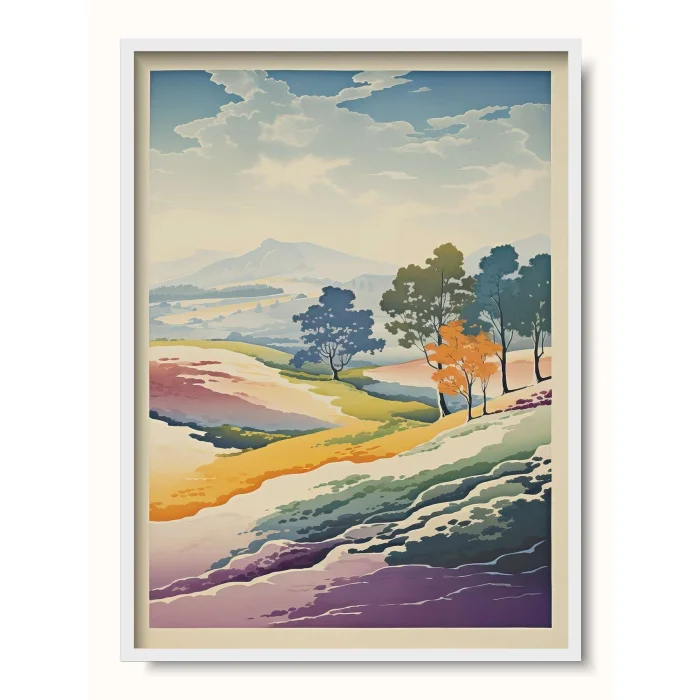 A landscape in which the landscape is layered, a depiction of different terrains and seasons at once.