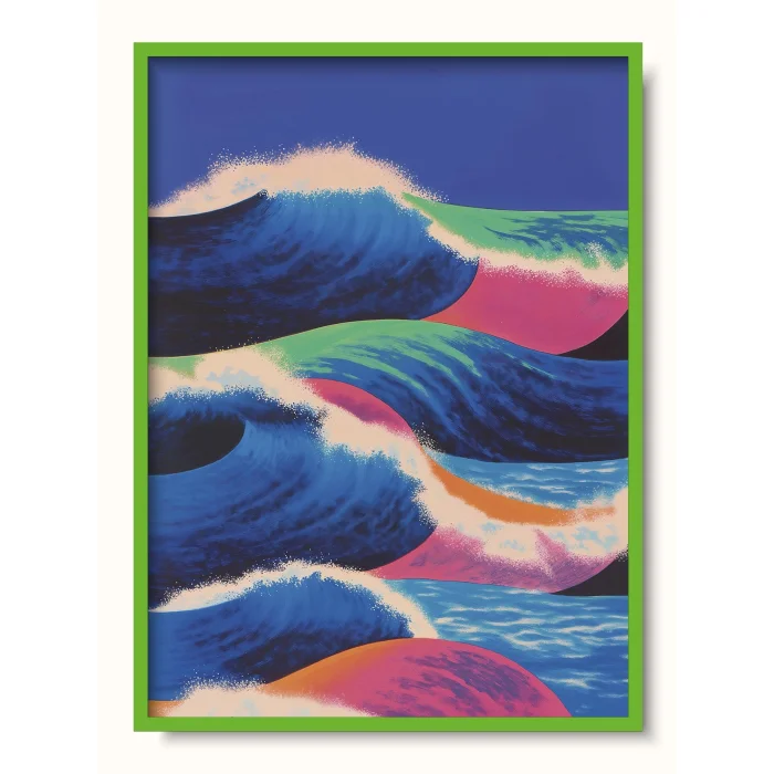 Giant, rolling ocean waves in vibrant hues.