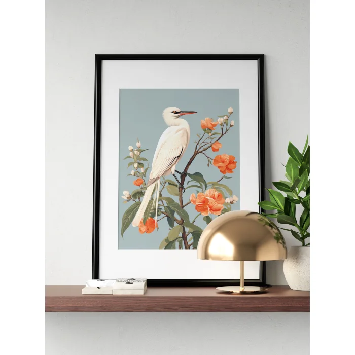 A white tropical bird watches the vast sky through orange flowers.