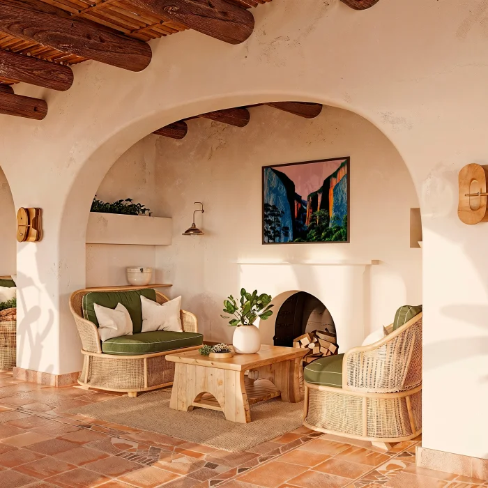A vibrant valley landscape of blue and orange cliffs.