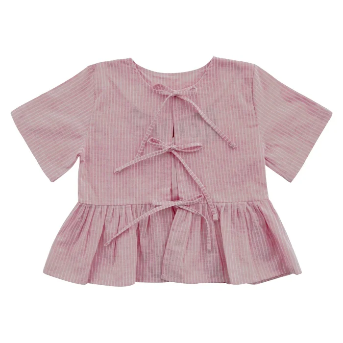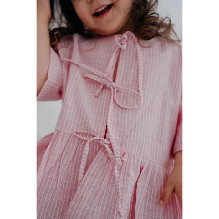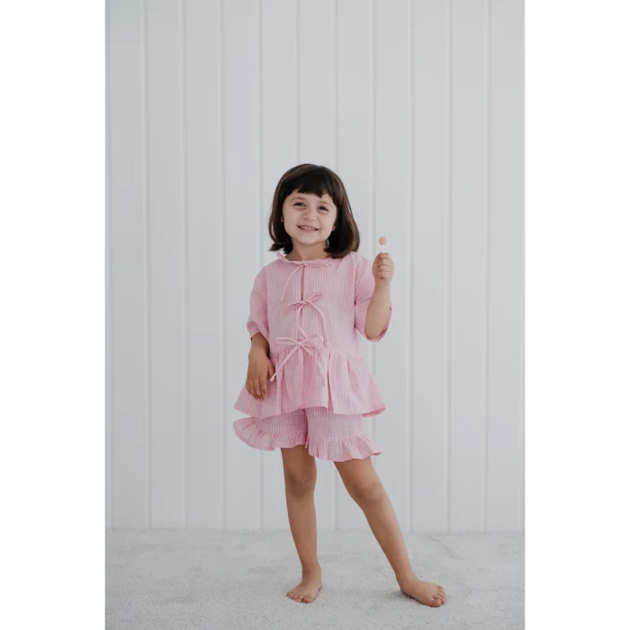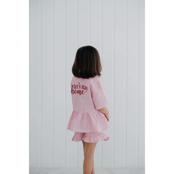 Cotton fabric. Pink and white striped fabric. Short-sleeved girls' pajama top. Easy to wear with ties. Three bow details. 'let's stay home' embroidery detail on the back. It is sent in handmade cotton ilo+friends bags. Like all of our products, it is handmade.