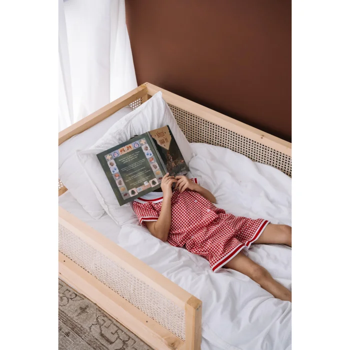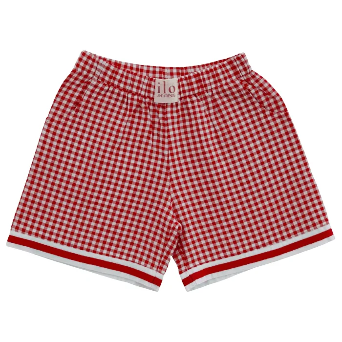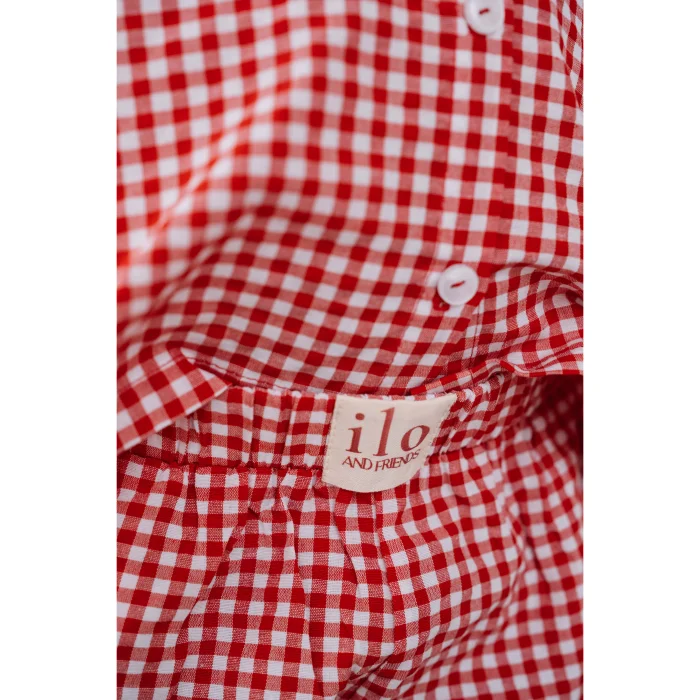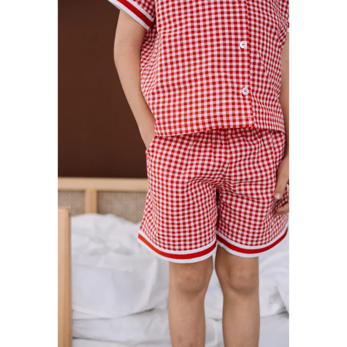 Cotton fabric. Red and white plaid fabric, girls' shorts, pajama bottoms. Elasticated waist and 2-pack pockets. Bell-cut legs with rounded ends and two ribbon details on the edges. It is sent in handmade cotton ilo+friends bags. Like all of our products, it is handmade.