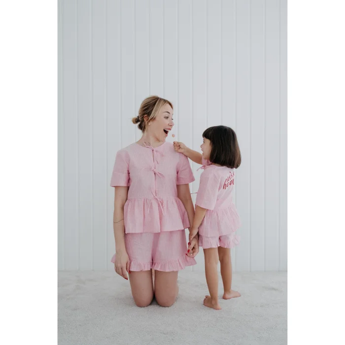 Cotton fabric. Pink and white striped fabric, girls' ruffled shorts pajama bottoms. Elasticated waist, easy and comfortable to wear. Ruffle details on the hems that expand towards the edges. It is sent in handmade cotton ilo+friends bags. Like all of our products, it is handmade.
