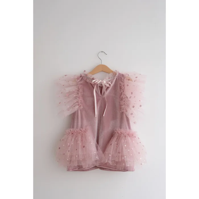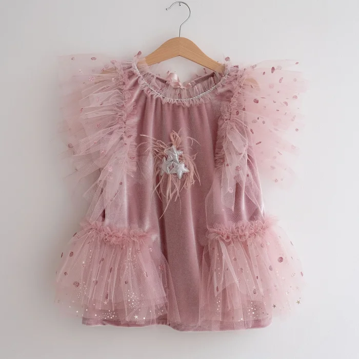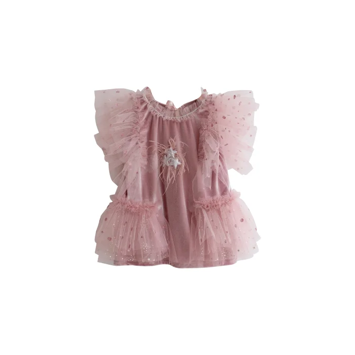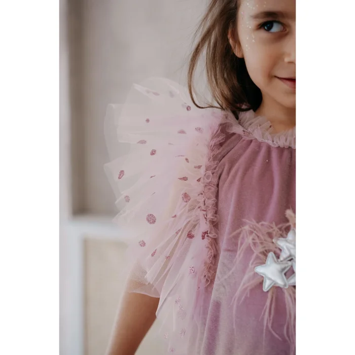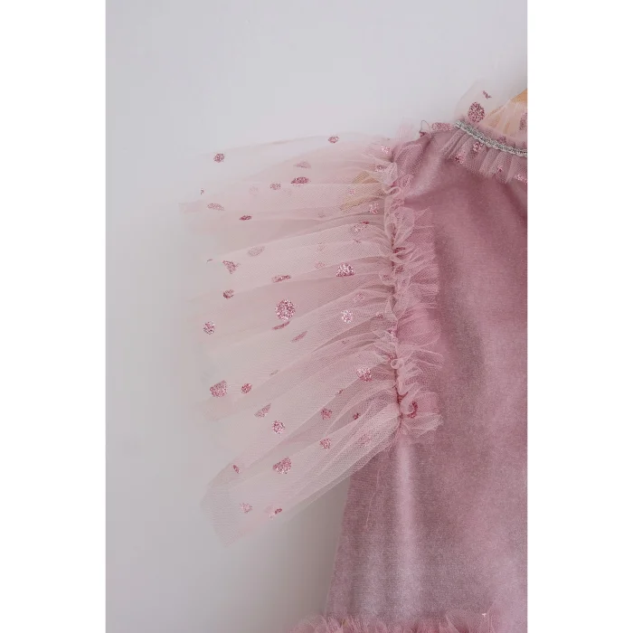 Pink velvet party dress with fluffy tulle on the sleeves and pockets. Star and otrish detail on the front.