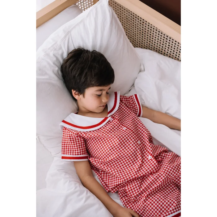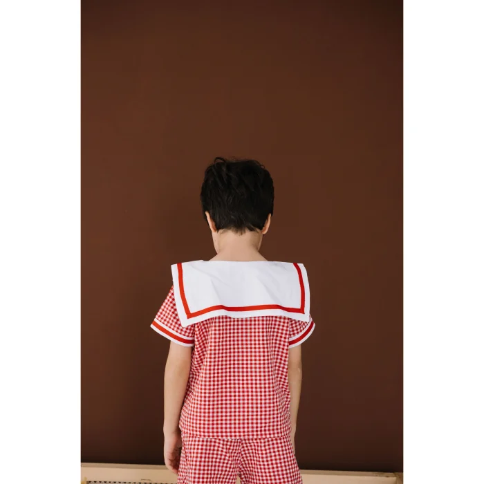 Cotton fabric. Red and white plaid fabric. Red piping detail on white sailor collar. White lining and red piping details on the sleeve ends. Buttoning with white buttons. It is sent in handmade cotton ilo+friends bags. Like all of our products, it is handmade.