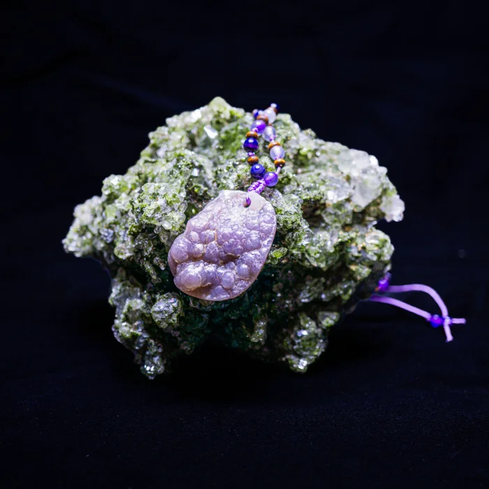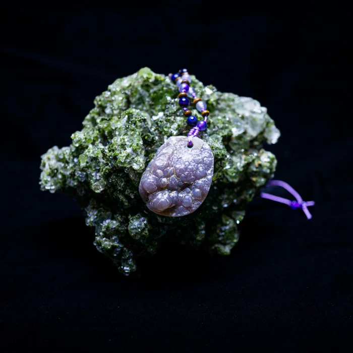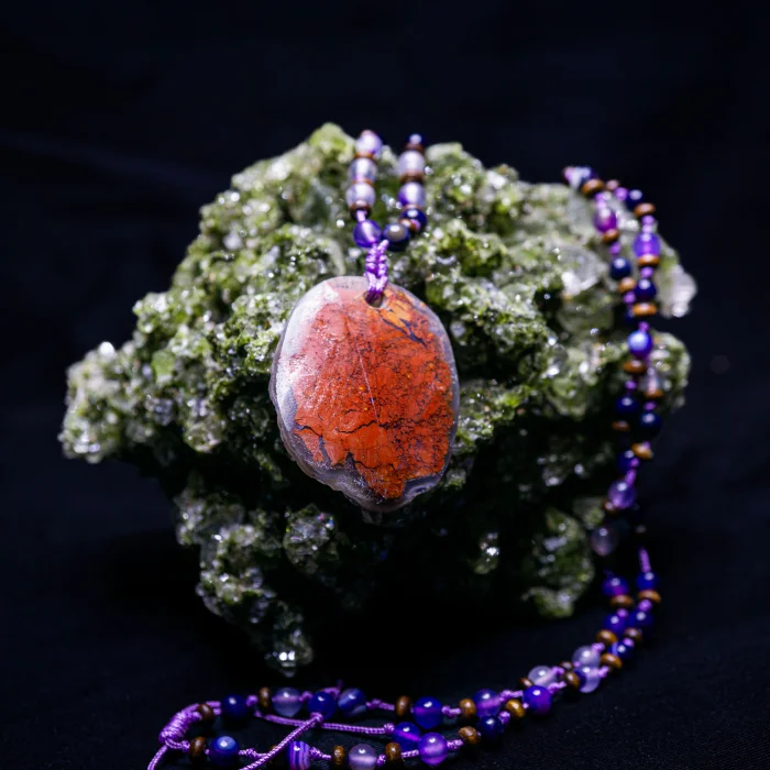 In this design, a form that we refer to as a kidney in nature welcomes us. Although the bubbly form of agate, that is, agate, is rarer, it offers us a wonderful natural appearance. Behind it, it fascinates our eyes with its red brown view. Amethyst stones were used around it. Agate stone acts as a protective shield.