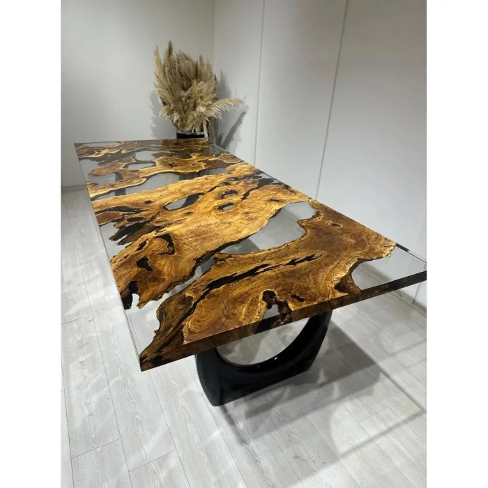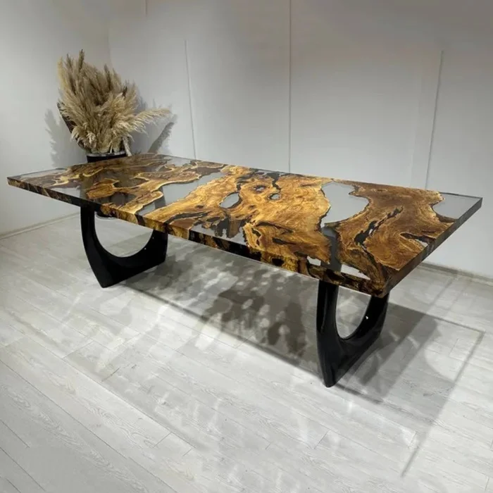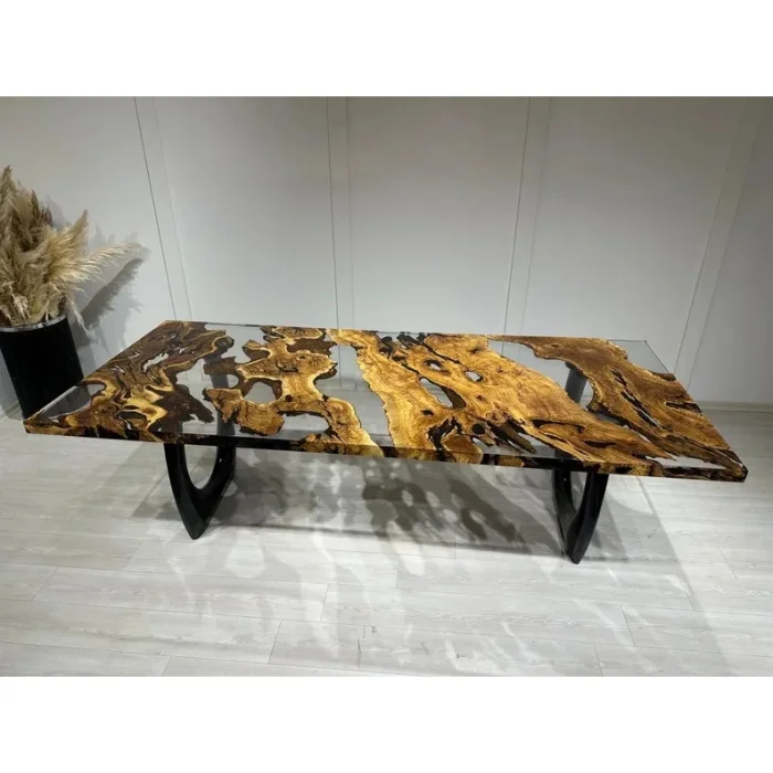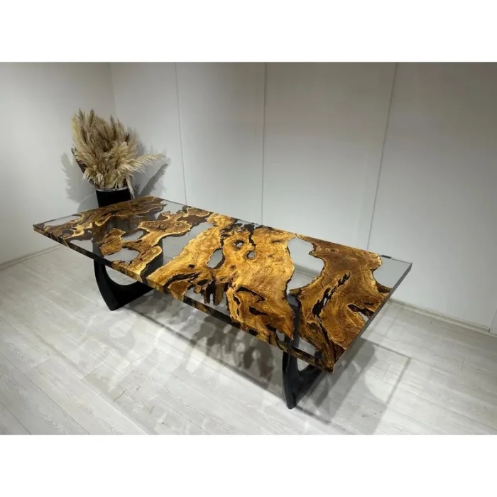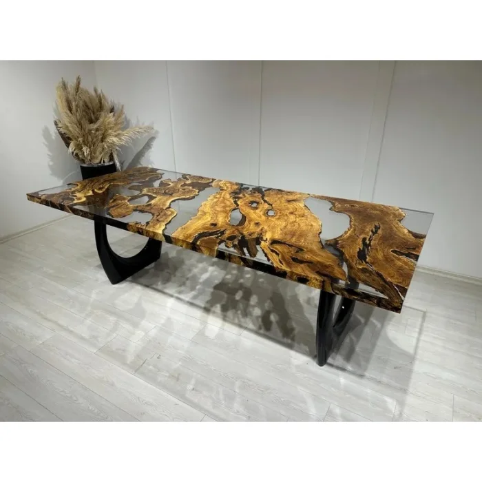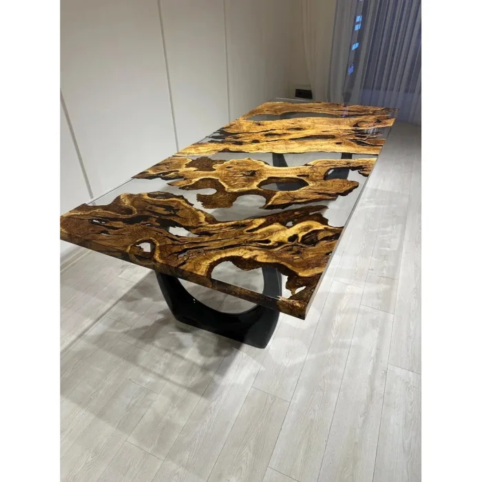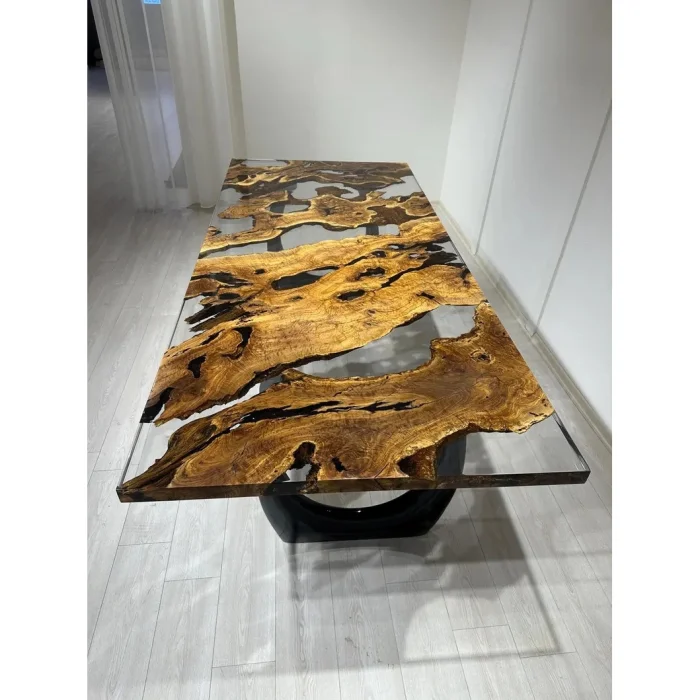 KEY FEATURES 100% Solid Olive Tree – 350-year-old, natural-grained aged olive slabs Transparent Epoxy River Design – Crystal clear look and customizable details Durable & Long-Lasting – Surface reinforced with natural protective oils FSC Certified Wood – Eco-friendly production from sustainable sources Unique Design – Unique vein, flow and character on each table PRODUCT DETAILS Made in: Turkey Customization: Epoxy color (transparent tones), dimensions, foot model and surface finish can be customized Measures: Length: 200 cm Width: 100 cm Height: 77 cm Thickness: 4–5 cm Ingredients: 350-Year-Old Solid Olive Tree Transparent Epoxy Resin PRODUCTION PROCESS AND QUALITY CONTROL Tree Selection – Approximately 350-year-old olive plates are carefully selected, and pre-production images are shared with you. Epoxy Casting – Crystal clear transparent epoxy casting is made by master craftsmen in accordance with the natural curves of the wood. Handcrafted Finishing – The table surface is sanded, polished and meticulously handcrafted. Natural Oil Protection – The wood is sealed with natural oils that protect its surface and add an aesthetic touch. SHIPPING & SAFE PACKAGING The product is securely packed in a special reinforced wooden crate. Free worldwide shipping – Estimated delivery time: 15 business days It is fully insured against damage caused by transportation. CARE AND USE RECOMMENDATIONS Wipe clean with a soft, damp cloth – no chemical products Keep away from direct sunlight and high heat The table allows for easy installation with pre-opened foot attachment points CARE ABOUT This particular table is manufactured in accordance with the principles of responsible forest management for FSC-certified olive wood. Its surface is protected by natural oils that do not contain chemicals. The epoxy we use is environmentally friendly, durable and long-lasting – made with respect for both your living space and nature. The Flow of Time in Your Home This table isn't just handmade; Unique. 350-year-old olive veins meet crystal clear epoxy, combining the raw beauty of nature and elegant design. Each table is a singular work that stands the test of time and adds art to your living space.