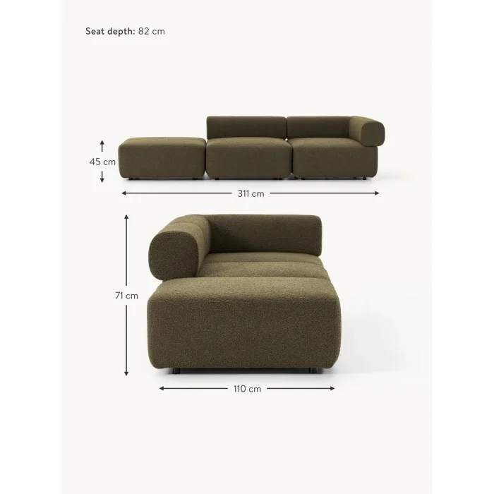 Properties Modular Structure: 3 different modules can be easily combined with the latch system or used separately. Flexible Use: The stool can be positioned to the right, left or independently. Sheath: Boucle fabric (80% polyester, 20% acrylic) Durability: 100,000 frictions in the Martindale test – suitable for heavy use. Filling: High density comfort foam (35 kg/m³) Frame: Beech wood, MDF, chipboard and durable cardboard backed construction Feet: Black plastic feet – lightweight, sturdy and ground-resistant. Colors: Off white, olive green, terracotta, turquoise green, gray blue, pink and dozens of color combinations Decor: Silver Feet: Black DELIVERY AND USE The product is delivered fully assembled, only the feet need to be attached. The fabric cover is not removable. All modules can be rearranged in different combinations. Made in Turkey. CARE ABOUT We care about protecting nature and sustainable production. As INNATURE, we produce with recyclable and environmentally friendly materials; We combine aesthetics with naturalness. Each piece is the product of long-lasting use and an environmentally friendly design approach.
