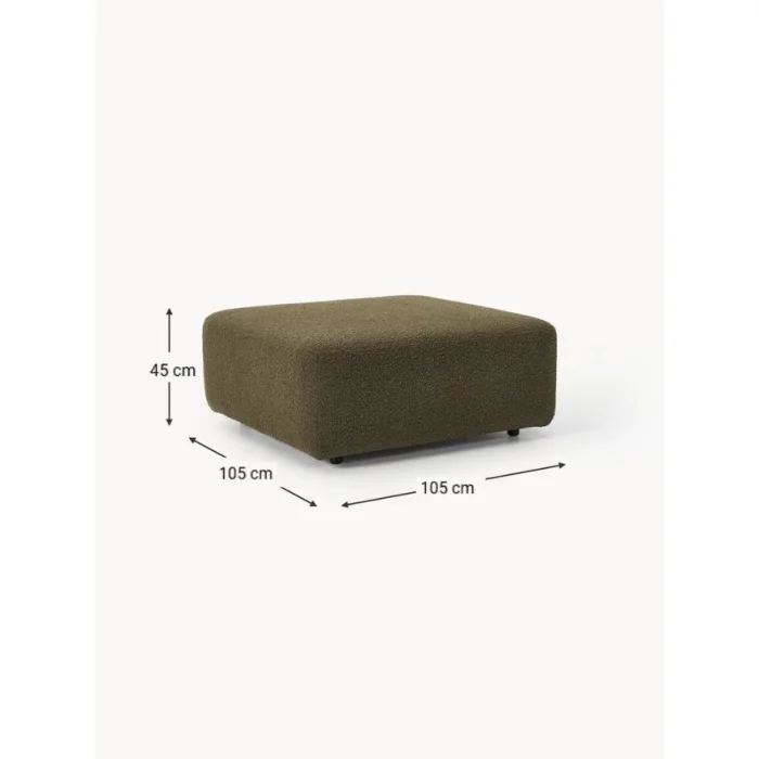 Properties Cover: Loop fabric (80% polyester, 20% acrylic) Filling: High density comfort foam (35 kg/m³) Durability: 100,000 rubs in the Martindale test – long-lasting use Frame: Beechwood, MDF, chipboard and supported structure Legs: Black plastic – sturdy, lightweight and gentle on the floor Colors: Off white, beige, gray, green and special production tone options DELIVERY & USAGE The product is delivered fully assembled. The fabric cover is not removable. Depending on your usage area, it can be freestanding or combined with Sofia sofa modules. Handcrafted in Turkey. CARE ABOUT As INNATURE, we adopt a production approach that is sensitive to nature and sustainability. All the wood we use is FSC certified, and our fabrics comply with OEKO-TEX® standards. Each Sofia pouf brings the elegance of nature and the quality of handicraft to your living space.