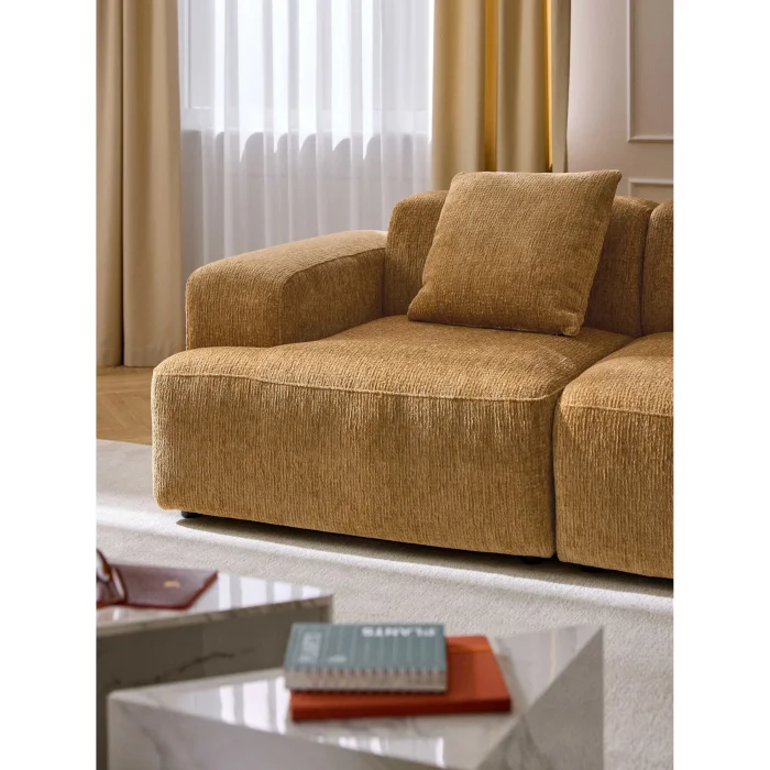 STELLA: THE NEW REPRESENTATIVE OF THE CLOUD SOFA TREND STELLA, the favorite of our InNature Collection design team, adds comfort and elegance to your modern seating areas with its rounded lines, compact dimensions and stylish fabric coverings. Reflecting the cloud sofa trend in the best way, STELLA redefines ultra comfort with its cool fabric options such as velvet and linen. Thanks to different width and depth options, you can adapt and expand STELLA to your personal space with modular stools. Highlights Rounded and modern design: Soft lines and timeless elegance. Maximum comfort: Nosag spring sole and high-density foam-padded seat. Modular use: Expandable and customizable with stool options. Durable and high-quality materials: Hornbeam frame, plywood and fiberboard combination. Use of FSC-certified wood: Made from sustainable sources. High wear resistance: Martindale 115,000 scrub durability, making it suitable for intensive use. OEKO-TEX certified fabric: Tested for harmful substances. Color options: Possibility to choose according to your style with different color alternatives. Material and Technical Information Coating: 100 percent polyester, corduroy, chenille and linen fabric alternatives are available. Filling: Nosag spring sole and sponge filling with a density of 35 kg/m³. Skeleton: A combination of hornbeam, plywood, and fiberboard. Legs: Black plastic material. We Care STELLA sofa is made with FSC-certified wood and fabrics that comply with OEKO-TEX standards. With our production approach that is sensitive to nature and health, we offer a sustainable and long-lasting living space.