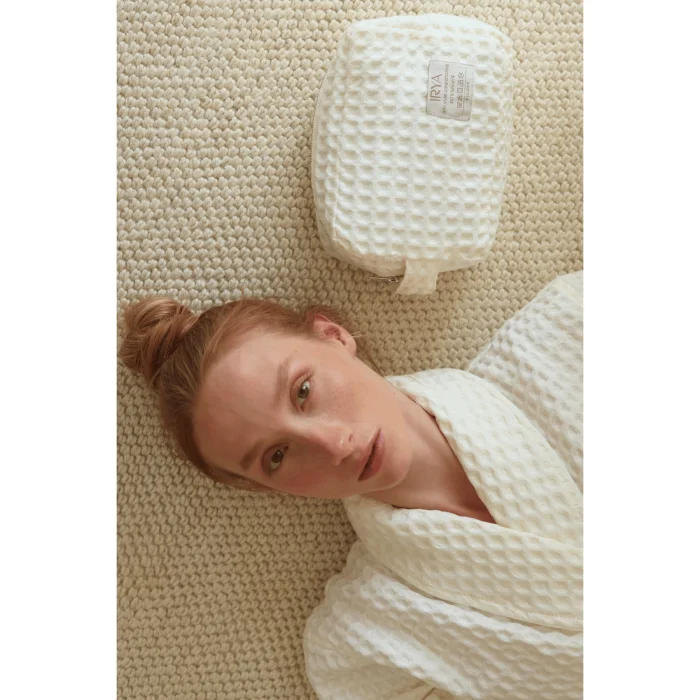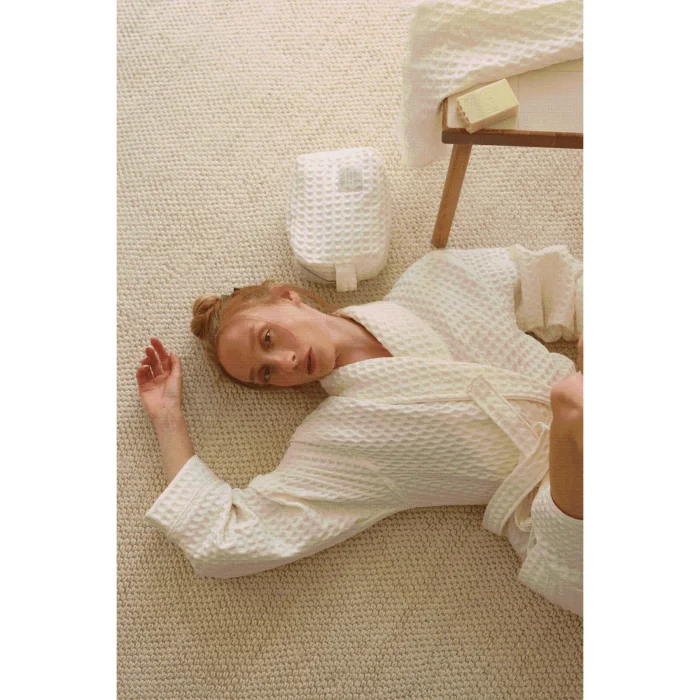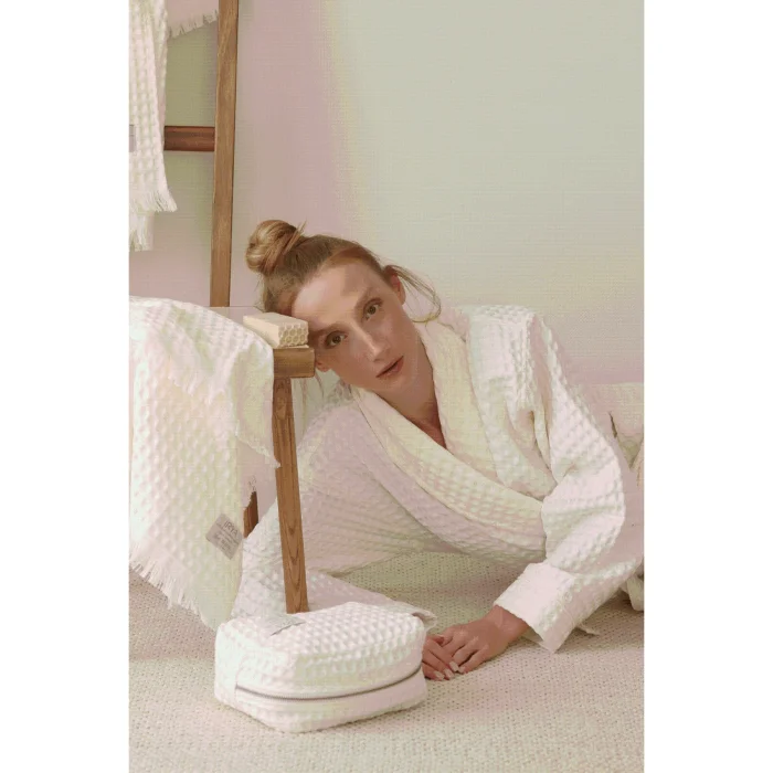 The special design, where timeless simplicity and naturalness meet, is made of 100% pure Turkish cotton.; Aura, which is light, breathable and highly absorbent with its waffle texture, offers fresh comfort at any time of the day.