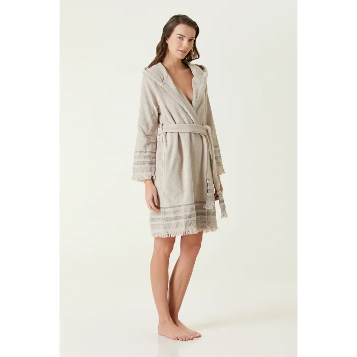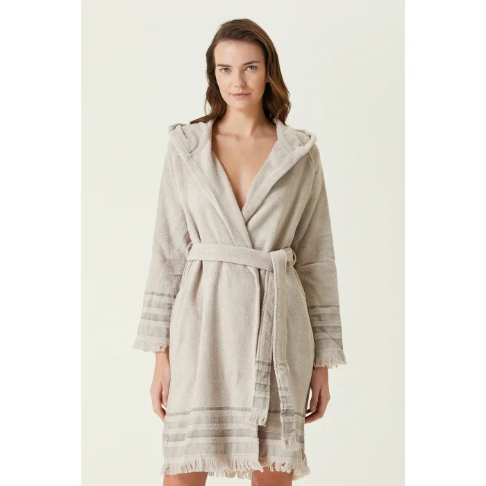 100% Turkish Cotton: Our bathrobes, which are made of quality Turkish cotton, stand out with their durability and natural softness. High Volume: Its high volume emphasizes the quality texture of our bathrobes. It offers a comfortable experience every time it is worn. ; High Absorbency: The high absorbency of our bathrobes provides maximum comfort after bathing and helps you dry quickly. ; Fast Drying: Thanks to its absorbency, it dries quickly and protects your skin and offers a comfortable post-bath experience. ; It is 340 gr/m². ; Model size: Height: 180 cm - Bust: 76 cm- Waist: 61 cm - Hips: 90 cm