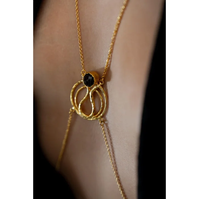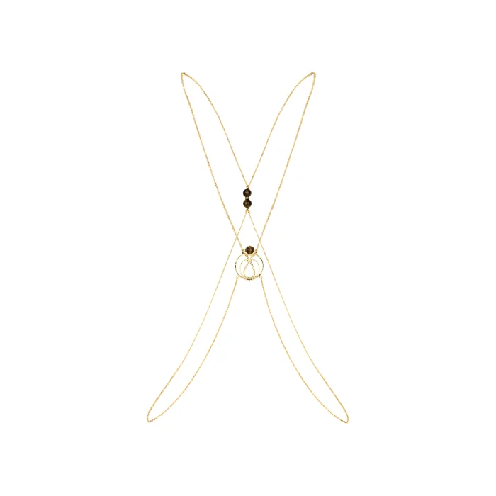 CATWALK Body Chain – Handmade brass, gold-plated, featuring natural Tiger's Eye stones.