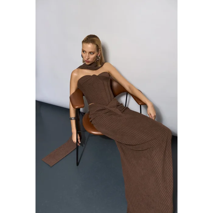 BROWN STRIPED MAXI SKIRT WITH FRONT AND BACK GATHERING DETAIL-