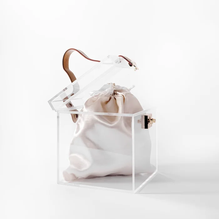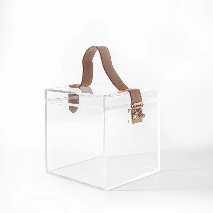 Handmade make-up bag with acrylic, leather handle, stainless lock and accessories