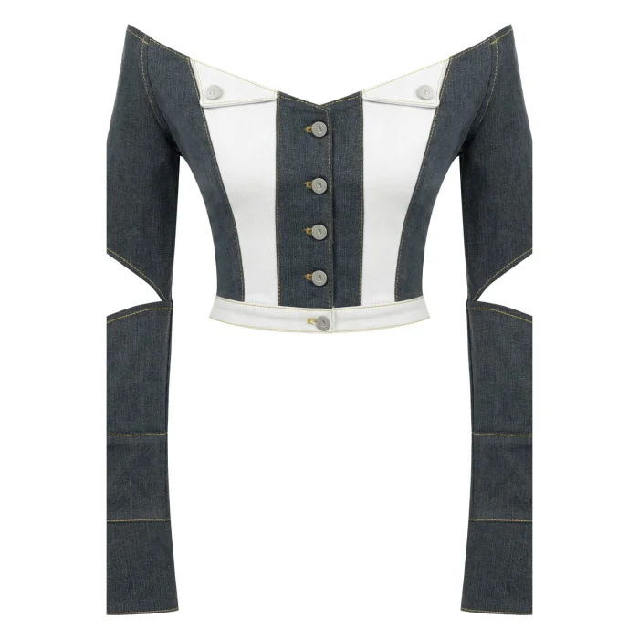 Cut from luxurious contrast-coloured denim, our Monte jacket exudes undeniable charm. This unique, front-buttoned, off-the-shoulder piece offers elegance. It is decorated