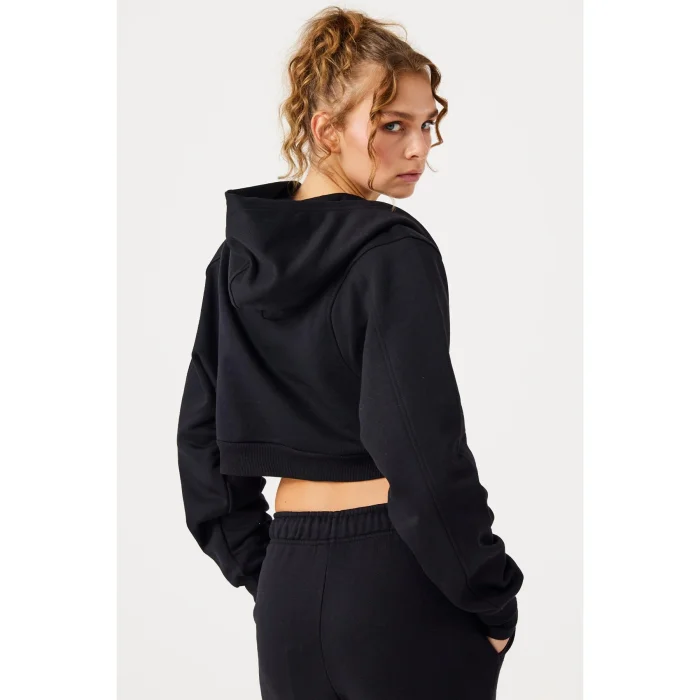 Aura Zippered Crop Hoodie, which combines elegance and comfort, adds a dynamic atmosphere to your style with its modern cut. The crop design, which ends at waist level, stands out with its feminine stance, while its simple form offers a minimal and flowing look. The hooded structure and front zipper detail create a sporty and stylish style while providing ease of use. The slightly fuzzy texture of the interior offers a soft feel all day long.