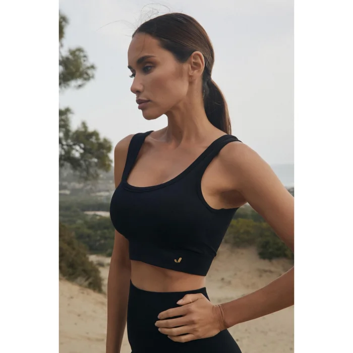 It is a high-support sports bra with thick double color welt shoulder straps. For extra protection, it is double-layered and contains a container.