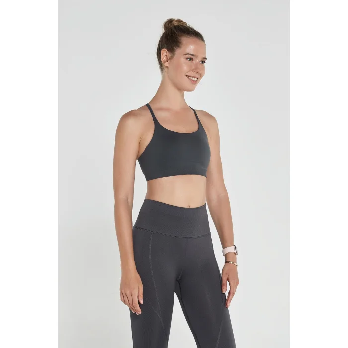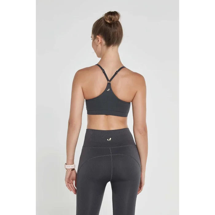 The Pine Bra is a soft-textured, light-backed bralette style with a round neckline and adjustable spaghetti strap at the back. There are removable pads inside the bra.