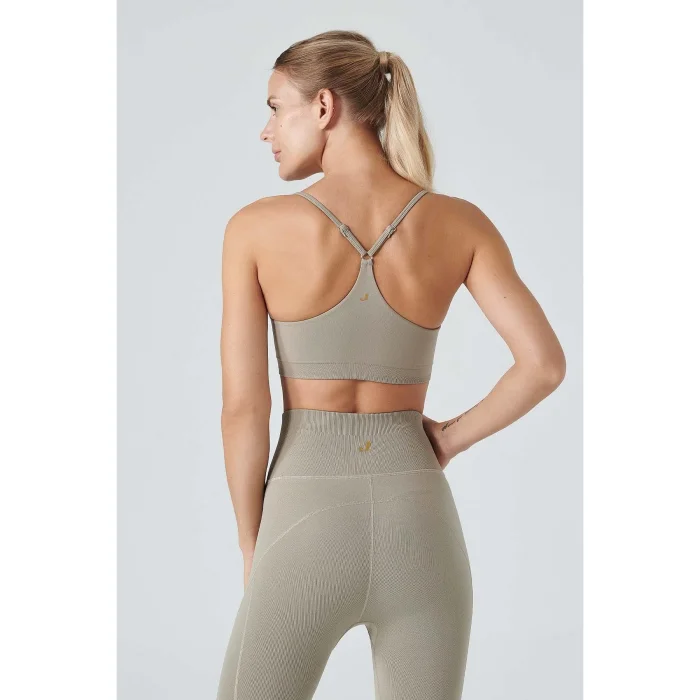 The Pine Bra is a soft-textured, light-backed bralette style with a round neckline and adjustable spaghetti strap at the back. There are removable pads inside the bra.