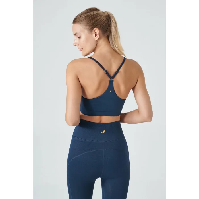 The Pine Bra is a soft-textured, light-backed bralette style with a round neckline and adjustable spaghetti strap at the back. There are removable pads inside the bra.