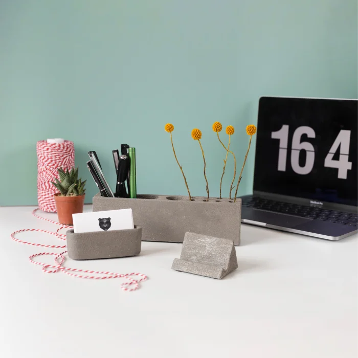 Our corporate pen holderproduct set consists of 3 parts: pen holder, card holder and phone holder. Our office decoration products, which are produced with special concrete mortar, have tiny air gaps caused by the natural structure of concrete.