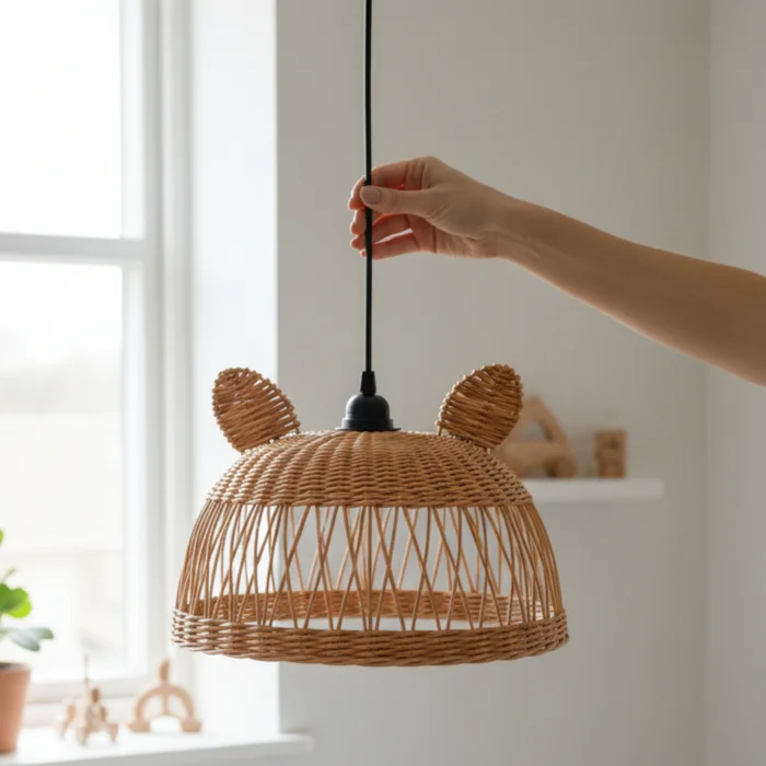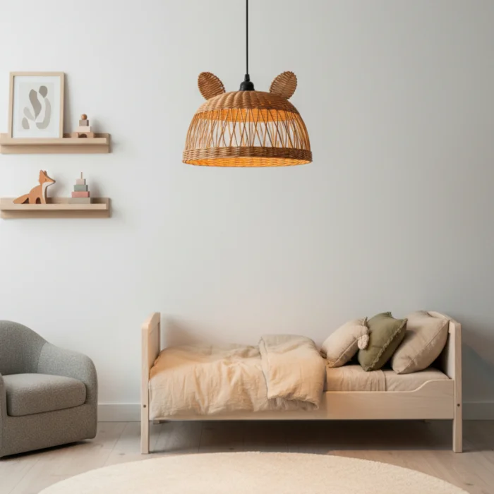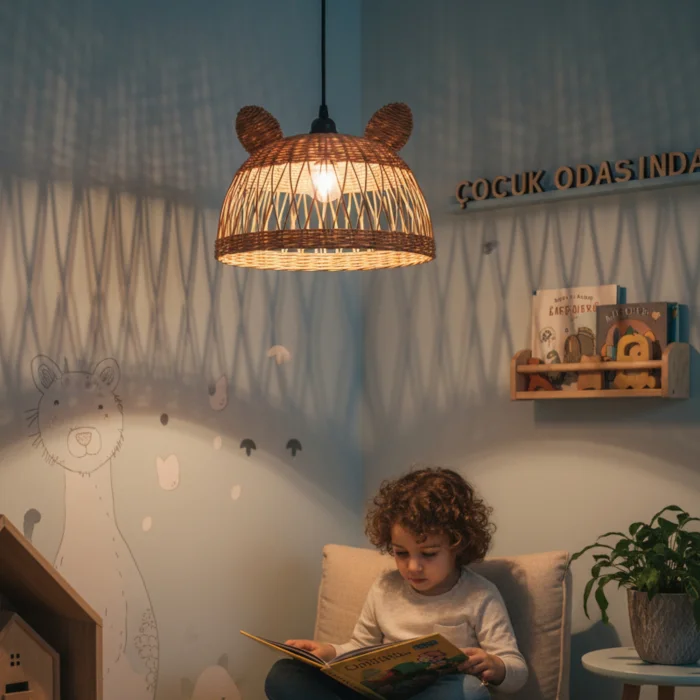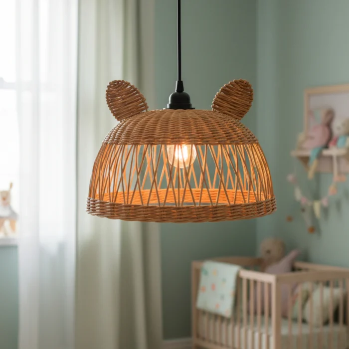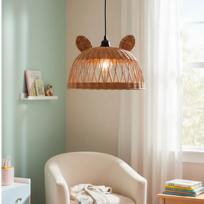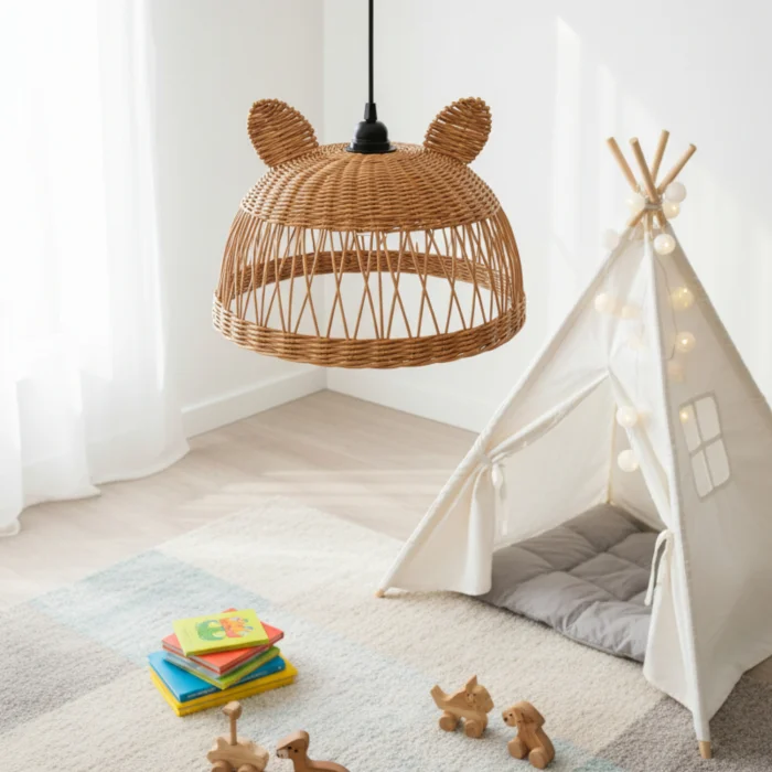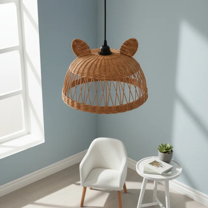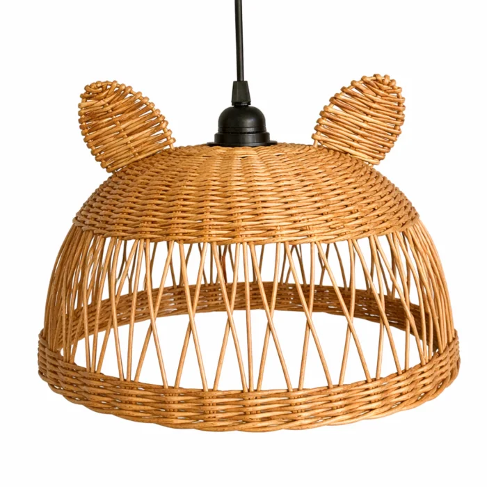 It creates a fun and warm ambiance in children's rooms with its cute mouse form and natural rattan texture. It creates a fairy-tale atmosphere by filtering light softly.
