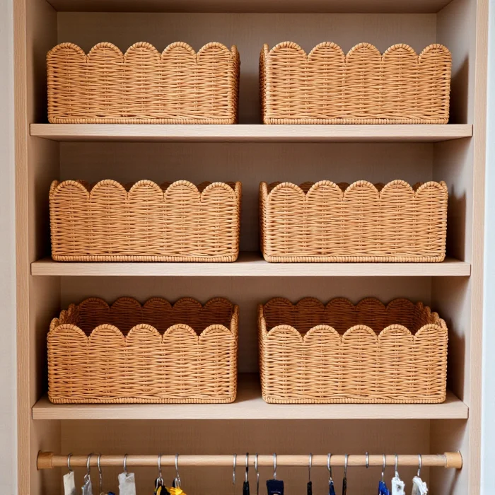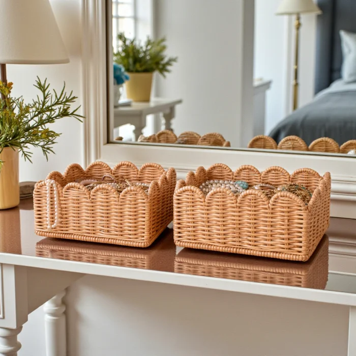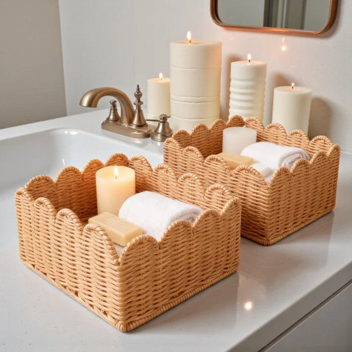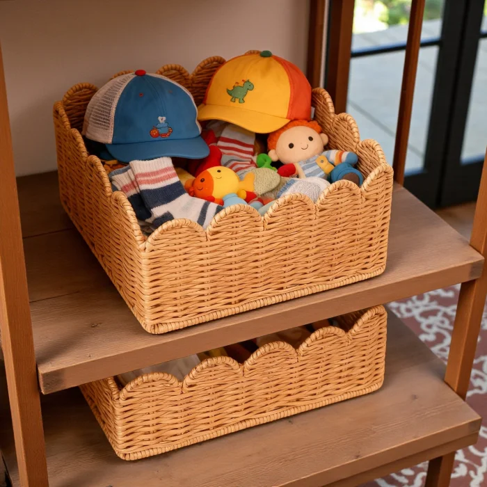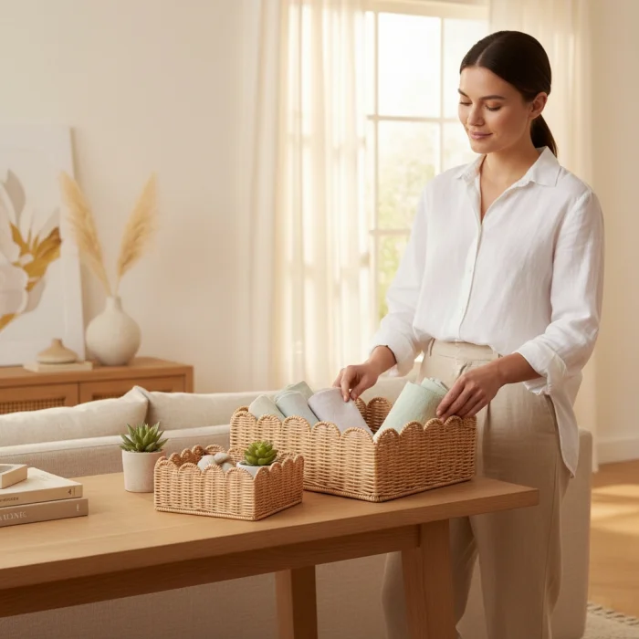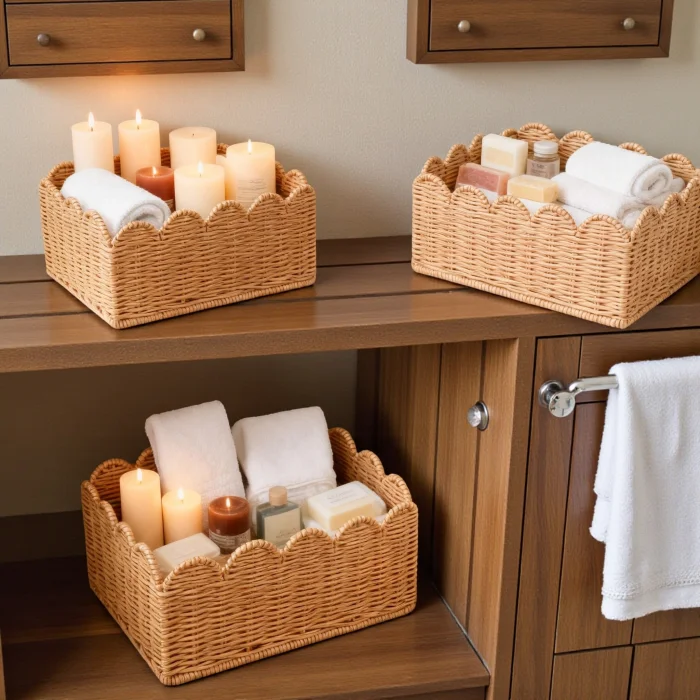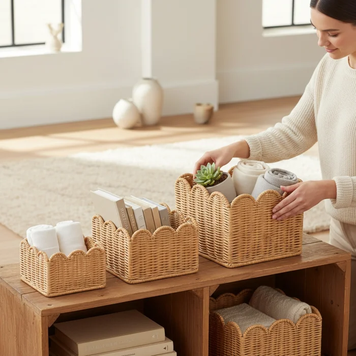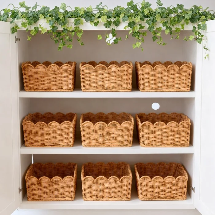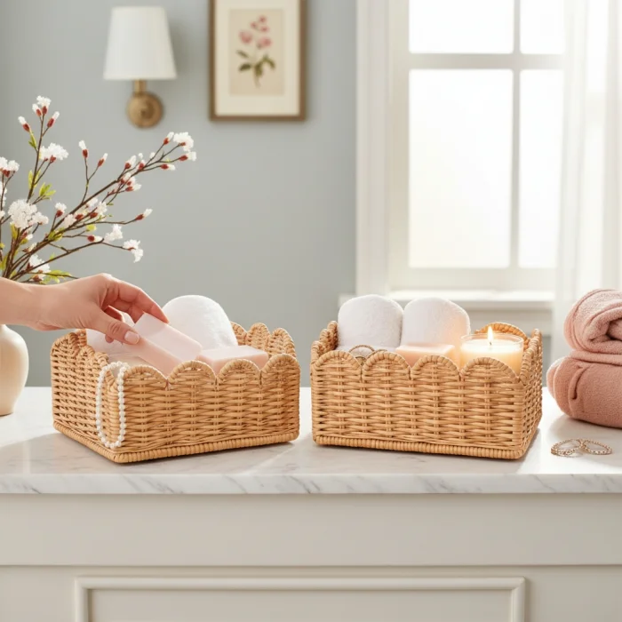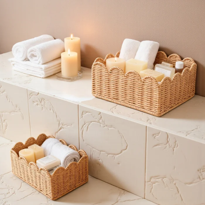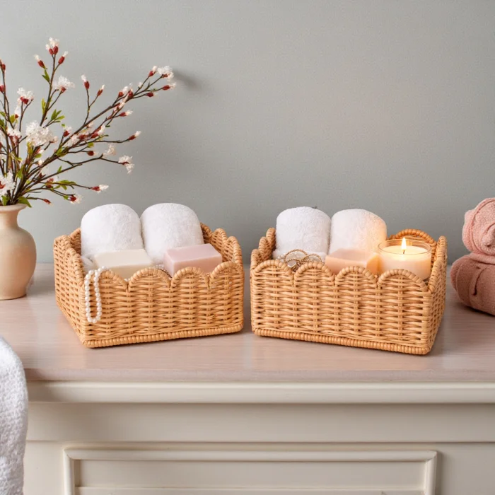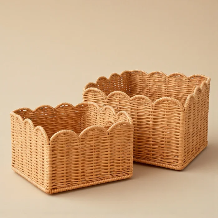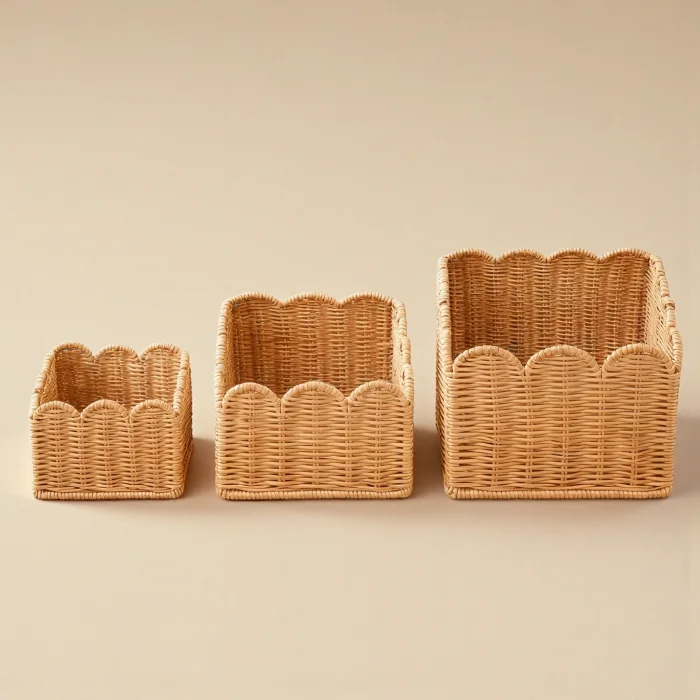 Made from natural rattan material, the 3-piece rattan basket set offers a stylish and functional solution for home organization and decoration. Thanks to its handmade production, each basket has its own unique texture. With its nestable design, it takes up minimal space when not in use. It can be used as an organizer in many areas such as wardrobes, dressing rooms, children's rooms, bathrooms and living rooms. Thanks to its natural color and wavy mouth form, it is compatible with modern, bohemian and Scandinavian decoration styles.